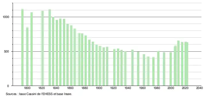 L'évolution du nombre d'habitants est connue à travers les recensements de la population effectués dans la commune depuis 1793. Pour les communes de moins de 10 000 habitants, une enquête de recensement portant sur toute la population est réalisée tous les cinq ans, les populations de référence des années intermédiaires étant quant à elles estimées par interpolation ou extrapolation[24]. Pour la commune, le premier recensement exhaustif entrant dans le cadre du nouveau dispositif a été réalisé en 2005[25].