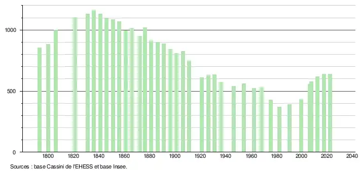 L'évolution du nombre d'habitants est connue à travers les recensements de la population effectués dans la commune depuis 1793. Pour les communes de moins de 10 000 habitants, une enquête de recensement portant sur toute la population est réalisée tous les cinq ans, les populations de référence des années intermédiaires étant quant à elles estimées par interpolation ou extrapolation[21]. Pour la commune, le premier recensement exhaustif entrant dans le cadre du nouveau dispositif a été réalisé en 2007[22].