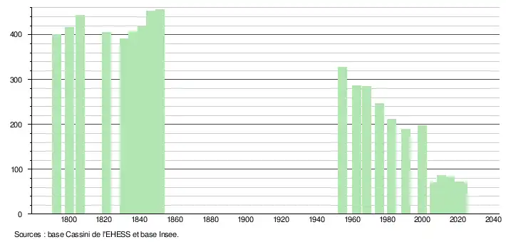 L'évolution du nombre d'habitants est connue à travers les recensements de la population effectués dans la commune depuis 1793. Pour les communes de moins de 10 000 habitants, une enquête de recensement portant sur toute la population est réalisée tous les cinq ans, les populations de référence des années intermédiaires étant quant à elles estimées par interpolation ou extrapolation[20]. Pour la commune, le premier recensement exhaustif entrant dans le cadre du nouveau dispositif a été réalisé en 2005[21].