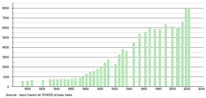 - ↑ Population municipale de référence en vigueur au 1er janvier 2025, millésimée 2022, définie dans les limites territoriales en vigueur au 1er janvier 2024, date de référence statistique : 1er janvier 2022.