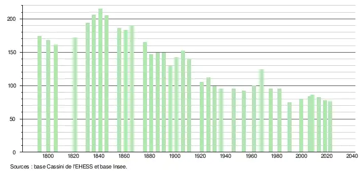 L'évolution du nombre d'habitants est connue à travers les recensements de la population effectués dans la commune depuis 1793. Pour les communes de moins de 10 000 habitants, une enquête de recensement portant sur toute la population est réalisée tous les cinq ans, les populations de référence des années intermédiaires étant quant à elles estimées par interpolation ou extrapolation[27]. Pour la commune, le premier recensement exhaustif entrant dans le cadre du nouveau dispositif a été réalisé en 2008[28].