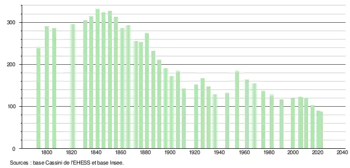 L'évolution du nombre d'habitants est connue à travers les recensements de la population effectués dans la commune depuis 1793. Pour les communes de moins de 10 000 habitants, une enquête de recensement portant sur toute la population est réalisée tous les cinq ans, les populations de référence des années intermédiaires étant quant à elles estimées par interpolation ou extrapolation[17]. Pour la commune, le premier recensement exhaustif entrant dans le cadre du nouveau dispositif a été réalisé en 2005[18].