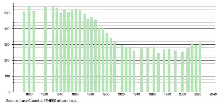 L'évolution du nombre d'habitants est connue à travers les recensements de la population effectués dans la commune depuis 1793. Pour les communes de moins de 10 000 habitants, une enquête de recensement portant sur toute la population est réalisée tous les cinq ans, les populations de référence des années intermédiaires étant quant à elles estimées par interpolation ou extrapolation[16]. Pour la commune, le premier recensement exhaustif entrant dans le cadre du nouveau dispositif a été réalisé en 2007[17].