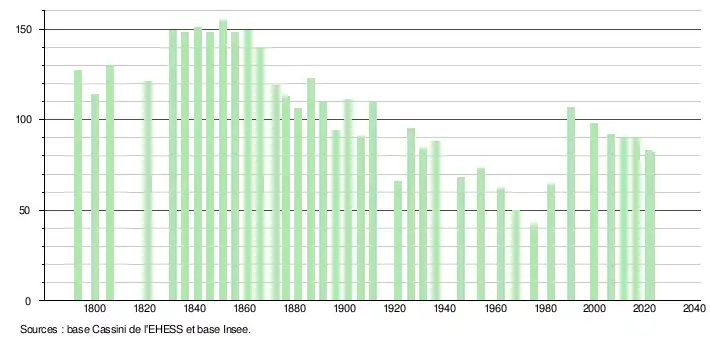 L'évolution du nombre d'habitants est connue à travers les recensements de la population effectués dans la commune depuis 1793. Pour les communes de moins de 10 000 habitants, une enquête de recensement portant sur toute la population est réalisée tous les cinq ans, les populations de référence des années intermédiaires étant quant à elles estimées par interpolation ou extrapolation[21]. Pour la commune, le premier recensement exhaustif entrant dans le cadre du nouveau dispositif a été réalisé en 2006[22].