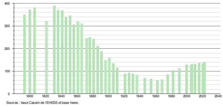 L'évolution du nombre d'habitants est connue à travers les recensements de la population effectués dans la commune depuis 1793. Pour les communes de moins de 10 000 habitants, une enquête de recensement portant sur toute la population est réalisée tous les cinq ans, les populations de référence des années intermédiaires étant quant à elles estimées par interpolation ou extrapolation[16]. Pour la commune, le premier recensement exhaustif entrant dans le cadre du nouveau dispositif a été réalisé en 2005[17].