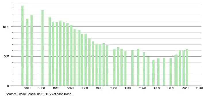L'évolution du nombre d'habitants est connue à travers les recensements de la population effectués dans la commune depuis 1793. Pour les communes de moins de 10 000 habitants, une enquête de recensement portant sur toute la population est réalisée tous les cinq ans, les populations de référence des années intermédiaires étant quant à elles estimées par interpolation ou extrapolation[31]. Pour la commune, le premier recensement exhaustif entrant dans le cadre du nouveau dispositif a été réalisé en 2007[32].