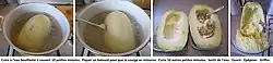 Pour une courge spaghetti de taille moyenne, ne pas dépasser 20 minutes de cuisson à l'eau, sinon la chair a plus un aspect de purée que de fils. Peut aussi se cuire au four.