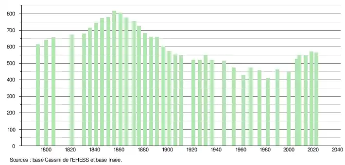L'évolution du nombre d'habitants est connue à travers les recensements de la population effectués dans la commune depuis 1793. Pour les communes de moins de 10 000 habitants, une enquête de recensement portant sur toute la population est réalisée tous les cinq ans, les populations de référence des années intermédiaires étant quant à elles estimées par interpolation ou extrapolation[20]. Pour la commune, le premier recensement exhaustif entrant dans le cadre du nouveau dispositif a été réalisé en 2008[21].
