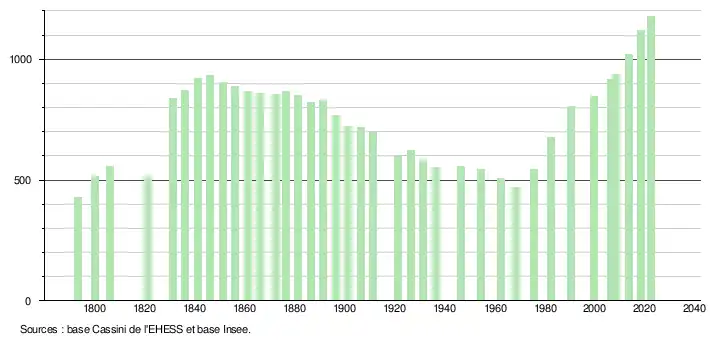 L'évolution du nombre d'habitants est connue à travers les recensements de la population effectués dans la commune depuis 1793. Pour les communes de moins de 10 000 habitants, une enquête de recensement portant sur toute la population est réalisée tous les cinq ans, les populations de référence des années intermédiaires étant quant à elles estimées par interpolation ou extrapolation[17]. Pour la commune, le premier recensement exhaustif entrant dans le cadre du nouveau dispositif a été réalisé en 2008[18].