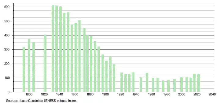 L'évolution du nombre d'habitants est connue à travers les recensements de la population effectués dans la commune depuis 1793. Pour les communes de moins de 10 000 habitants, une enquête de recensement portant sur toute la population est réalisée tous les cinq ans, les populations de référence des années intermédiaires étant quant à elles estimées par interpolation ou extrapolation[20]. Pour la commune, le premier recensement exhaustif entrant dans le cadre du nouveau dispositif a été réalisé en 2006[21].