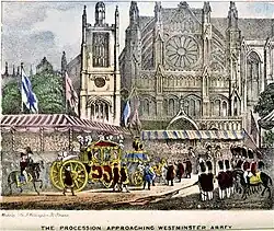 Avant 1838, seule la pairie participait à un couronnement. Les cérémonies de la journée auraient commencé à Westminster Hall (maintenant rattaché aux chambres du Parlement) et, une fois terminées, les pairs auraient marché ensemble de l'autre côté de la route menant à l'abbaye de Westminster, où ils ont vu le monarque couronné[8]. Cependant, conformément au nouveau plan de Melbourne, les cérémonies traditionnelles à Westminster Hall et la procession à l'abbaye ont été remplacées par deux processions beaucoup plus longues à travers Londres. Victoria a voyagé à l'intérieur du Gold State Coach (également connu sous le nom de Coronation Coach), conçu pour George III en 1762, dans le cadre d'une procession qui comprenait de nombreux autres entraîneurs et d'une escorte de cavalerie[3],[14]. Selon The Gentleman's Magazine, il s'agissait de la plus longue procession de couronnement depuis celle de Charles II en 1660[15]. Une grande partie du budget a été utilisée pour payer la procession et il n'y a donc pas eu de banquet de couronnement.