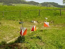 Le symbole international de la course d'orientation, à l'origine rouge et blanc. Ce symbole est utilisé sur les balises qui servent à marquer les points de contrôle d'une course d'orientation.