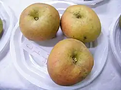 Fruit moyen, reinettiforme, aplati aux deux pôles, elle est aussi appelée "Reinette des Belges".