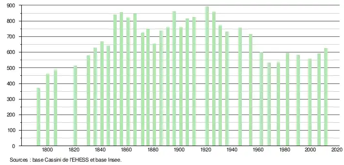 L'évolution du nombre d'habitants est connue à travers les recensements de la population effectués dans la commune depuis 1793. À partir du , les populations légales des communes sont publiées annuellement dans le cadre d'un recensement qui repose désormais sur une collecte d'information annuelle, concernant successivement tous les territoires communaux au cours d'une période de cinq ans. Pour les communes de moins de 10 000 habitants, une enquête de recensement portant sur toute la population est réalisée tous les cinq ans, les populations légales des années intermédiaires étant quant à elles estimées par interpolation ou extrapolation[9]. Pour la commune, le premier recensement exhaustif entrant dans le cadre du nouveau dispositif a été réalisé en 2006[10],[Note 2].