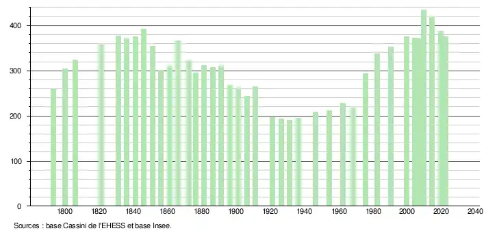 L'évolution du nombre d'habitants est connue à travers les recensements de la population effectués dans la commune depuis 1793. Pour les communes de moins de 10 000 habitants, une enquête de recensement portant sur toute la population est réalisée tous les cinq ans, les populations de référence des années intermédiaires étant quant à elles estimées par interpolation ou extrapolation[24]. Pour la commune, le premier recensement exhaustif entrant dans le cadre du nouveau dispositif a été réalisé en 2004[25].
