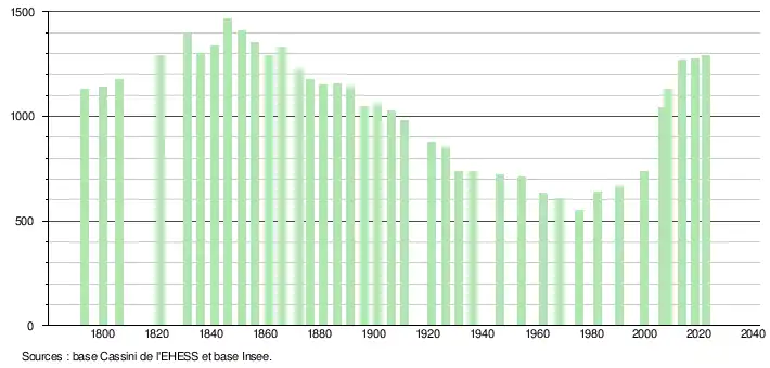 L'évolution du nombre d'habitants est connue à travers les recensements de la population effectués dans la commune depuis 1793. Pour les communes de moins de 10 000 habitants, une enquête de recensement portant sur toute la population est réalisée tous les cinq ans, les populations de référence des années intermédiaires étant quant à elles estimées par interpolation ou extrapolation[17]. Pour la commune, le premier recensement exhaustif entrant dans le cadre du nouveau dispositif a été réalisé en 2008[18].
