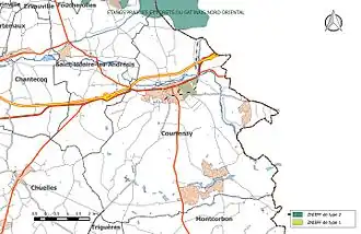 Courtenay est à la limite sud de la zone naturelle d'intérêt écologique, faunistique et floristique (ZNIEFF) continentale de type 2 des « Étangs, prairies et forêts du Gâtinais nord-oriental »[20], soit 5 060,23 hectares sur dix-sept communes[Note 3]. La ZNIEFF vise en priorité les habitats d'eaux douces stagnantes. On y trouve prairies humides, mégaphorbiaies, tourbières et marais, entrecoupés de bocages et de boisements. Les activités humaines présentes dans cette superficie sont majoritairement l'agriculture et la sylviculture, avec de l'élevage. La pêche et la chasse y sont pratiquées, et d'autres activités de tourisme et loisirs. L'habitat, composé surtout de fermes isolées, est très dispersé.