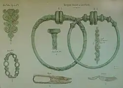 En 1873, des fouilles de M. Morel[31] mirent au jour plusieurs tombes gauloises au lieu-dit les Grands Ayeux avec torques, fibules et poteries. Une autre menée aux Closeaux de la Conche met au jour onze fosses avec deux torques à tampons dont un avec des figures humaines.