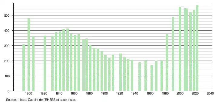 - ↑ Population municipale de référence en vigueur au 1er janvier 2025, millésimée 2022, définie dans les limites territoriales en vigueur au 1er janvier 2024, date de référence statistique : 1er janvier 2022.