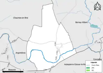 - l'Yerres[3], long de 98,23 km. Le territoire est situé sur son bassin versant et de ses affluents. L'extrême nord du territoire se situe à la source du ru des Vieux Prés, affluent du ru de Frégy qui rejoint le ru de Bréon à l'étang du Vivier.