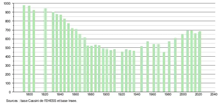 L'évolution du nombre d'habitants est connue à travers les recensements de la population effectués dans la commune depuis 1793. Pour les communes de moins de 10 000 habitants, une enquête de recensement portant sur toute la population est réalisée tous les cinq ans, les populations de référence des années intermédiaires étant quant à elles estimées par interpolation ou extrapolation[33]. Pour la commune, le premier recensement exhaustif entrant dans le cadre du nouveau dispositif a été réalisé en 2006[34].