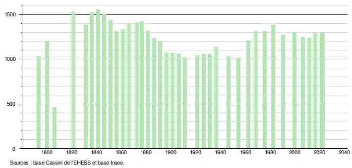 L'évolution du nombre d'habitants est connue à travers les recensements de la population effectués dans la commune depuis 1793. Pour les communes de moins de 10 000 habitants, une enquête de recensement portant sur toute la population est réalisée tous les cinq ans, les populations de référence des années intermédiaires étant quant à elles estimées par interpolation ou extrapolation[17]. Pour la commune, le premier recensement exhaustif entrant dans le cadre du nouveau dispositif a été réalisé en 2006[18].