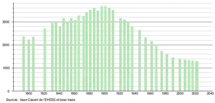 L'évolution du nombre d'habitants est connue à travers les recensements de la population effectués dans la commune depuis 1793. Pour les communes de moins de 10 000 habitants, une enquête de recensement portant sur toute la population est réalisée tous les cinq ans, les populations de référence des années intermédiaires étant quant à elles estimées par interpolation ou extrapolation[24]. Pour la commune, le premier recensement exhaustif entrant dans le cadre du nouveau dispositif a été réalisé en 2006[25].