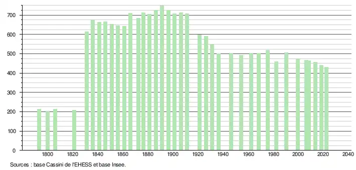 L'évolution du nombre d'habitants est connue à travers les recensements de la population effectués dans la commune depuis 1793. Pour les communes de moins de 10 000 habitants, une enquête de recensement portant sur toute la population est réalisée tous les cinq ans, les populations de référence des années intermédiaires étant quant à elles estimées par interpolation ou extrapolation[25]. Pour la commune, le premier recensement exhaustif entrant dans le cadre du nouveau dispositif a été réalisé en 2008[26].
