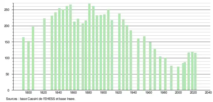 L'évolution du nombre d'habitants est connue à travers les recensements de la population effectués dans la commune depuis 1793. Pour les communes de moins de 10 000 habitants, une enquête de recensement portant sur toute la population est réalisée tous les cinq ans, les populations de référence des années intermédiaires étant quant à elles estimées par interpolation ou extrapolation[25]. Pour la commune, le premier recensement exhaustif entrant dans le cadre du nouveau dispositif a été réalisé en 2008[26].