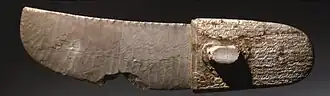 - Le couteau Pitt-Rivers, acquis au milieu du XIXe siècle par le révérend G. Chester auprès d'un antiquaire qui prétendait l'avoir trouvé à Sheikh Hamada, près de Sohag en Haute-Égypte. Ce couteau date de la fin de la période prédynastique, entre 3300 et 3100 av. J.-C.[11] et est aujourd'hui exposé dans la galerie « Early Egypt » du British Museum, salle 64, sous le numéro de catalogue EA 68512[12]. La lame de ce couteau est pratiquement identique à celle du couteau du Gebel el-Arak, bien que légèrement plus grande[3]. L'iconographie du manche est similaire à celle du « couteau rituel », il comprend six rangées d'animaux sauvages sculptés en relief. Parmi ces animaux, on distingue des éléphants marchant sur des serpents, des cigognes, un héron, des lions suivis par un chien, du bétail à cornes courtes et à cornes longues, ce qui ressemble à des chacals, un ibis, un cerf, des bubales, des oryx et un mouflon à manchettes[13]. Des motifs similaires sont présents sur des poteries et sceaux en argile dans les complexes funéraires datant de la période prédynastique et des premières dynasties, en particulier à Abydos[3],[14].