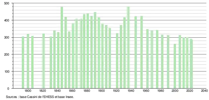 L'évolution du nombre d'habitants est connue à travers les recensements de la population effectués dans la commune depuis 1793. Pour les communes de moins de 10 000 habitants, une enquête de recensement portant sur toute la population est réalisée tous les cinq ans, les populations de référence des années intermédiaires étant quant à elles estimées par interpolation ou extrapolation[19]. Pour la commune, le premier recensement exhaustif entrant dans le cadre du nouveau dispositif a été réalisé en 2006[20].
