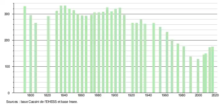 À partir du XXIesiècle, les recensements réels des communes de moins de 10 000 habitants ont lieu tous les cinq ans. Pour Coutières, cela correspond à 2008, 2013, 2018[3], etc. Les autres dates de «recensements» (2006, 2009, etc.) sont des estimations légales.