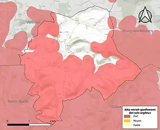 Les mouvements de terrains susceptibles de se produire sur la commune sont des tassements différentiels[37]. Le retrait-gonflement des sols argileux est susceptible d'engendrer des dommages importants aux bâtiments en cas d’alternance de périodes de sécheresse et de pluie[38]. 71,4 % de la superficie communale est en aléa moyen ou fort (58,6 % au niveau départemental et 48,5 % au niveau national métropolitain)[Carte 4]. Depuis le , en application de la loi ÉLAN, différentes contraintes s'imposent aux vendeurs, maîtres d'ouvrages ou constructeurs de biens situés dans une zone classée en aléa moyen ou fort[Note 4],[39].