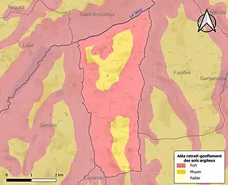 Le retrait-gonflement des sols argileux est susceptible d'engendrer des dommages importants aux bâtiments en cas d’alternance de périodes de sécheresse et de pluie. La totalité de la commune est en aléa moyen ou fort (92 % au niveau départemental et 48,5 % au niveau national). Sur les 47 bâtiments dénombrés sur la commune en 2019, 47 sont en aléa moyen ou fort, soit 100 %, à comparer aux 96 % au niveau départemental et 54 % au niveau national. Une cartographie de l'exposition du territoire national au retrait gonflement des sols argileux est disponible sur le site du BRGM[22],[Carte 3].