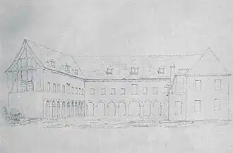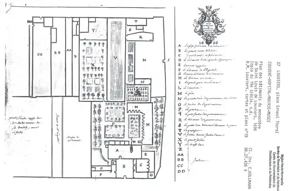 - 1696 : construction d'un premier quadrilatère de bâtiments comprenant l'église, le dortoir, la grange autour d'un cloître[1]. Le long de la rue de la Moue[24] se trouve le local des pensionnaires avec son propre parterre. Le cimetière des religieuses se trouve en arrière du cloître, rue de la Marre. Une grande cour donne accès à l'hôpital[25].
