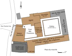Le couvent est formé d'un ensemble de bâtiments couvrant une superficie d'environ 2 900 m², organisés autour de deux cours intérieures. À l'ouest se trouve la cour des provisions et à l'est le cloître[4]. Les bâtiments présentent tous deux étages en plus du rez-de-chaussée, avec pour certains d'entre eux un étage de cave. Quatre escaliers répartis dans les bâtiments desservent les étages. L'ensemble des bâtiments présentent une orientation est-nord-est/ouest-sud-ouest correspondant globalement à celle de l'église du couvent, à l'exception du bâtiment occidental aligné sur la rue des granges[2]. Une petite place située au sud-ouest a été remplacée par l'auditorium de la médiathèque à la fin des années 2010[5].