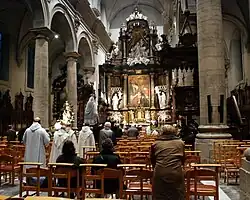 L'église, que l'on atteint par une rue débouchant dans la rue du Château (Burgstraat), présente un plan basilical à trois nefs et une façade baroque à volutes et pilastres, de facture assez sobre. La jouxtent les bâtiments du couvent, agencés autour d’une cour intérieure.