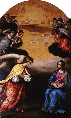 Au XVIIe siècle, un maître-autel a été monté dans l'église. Après la Révolution, il a été remonté dans le transept sud de l'église Saint-Jean de Caen. Cette œuvre du XVIIe siècle, endommagée en 1944, a été classée au titre d'objet le [15]. Des statues sont posées de chaque côté de l'élévation du retable : à gauche, saint Joseph et à droite sainte Thérèse d'Ávila. Au centre, on trouve une statue de taille plus réduite représentant sainte Catherine. Le centre du retable est orné par une toile représentant l'Annonciation. Cette toile ne semble pas avoir été conçue pour ce retable[13]. Alors que l'ensemble date de la fin du XVIIe siècle, il semble que le tableau soit antérieur à 1620.