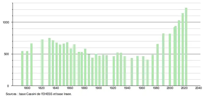 L'évolution du nombre d'habitants est connue à travers les recensements de la population effectués dans la commune depuis 1793. Pour les communes de moins de 10 000 habitants, une enquête de recensement portant sur toute la population est réalisée tous les cinq ans, les populations de référence des années intermédiaires étant quant à elles estimées par interpolation ou extrapolation[36]. Pour la commune, le premier recensement exhaustif entrant dans le cadre du nouveau dispositif a été réalisé en 2007[37].