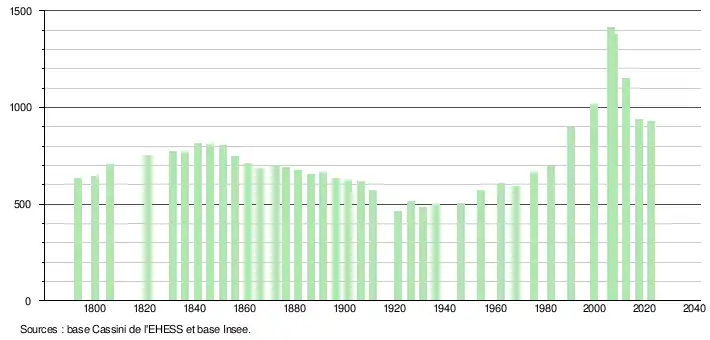 L'évolution du nombre d'habitants est connue à travers les recensements de la population effectués dans la commune depuis 1793. Pour les communes de moins de 10 000 habitants, une enquête de recensement portant sur toute la population est réalisée tous les cinq ans, les populations de référence des années intermédiaires étant quant à elles estimées par interpolation ou extrapolation[30]. Pour la commune, le premier recensement exhaustif entrant dans le cadre du nouveau dispositif a été réalisé en 2007[31].
