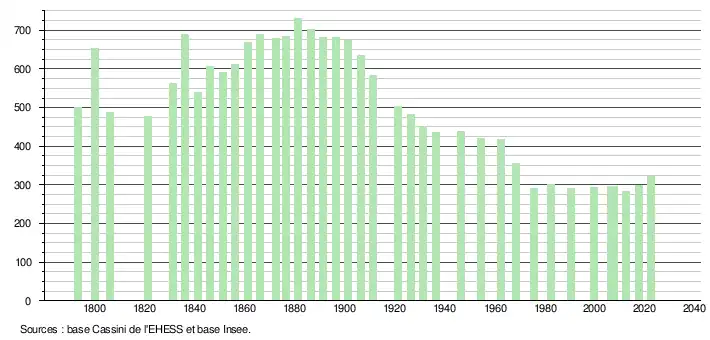 L'évolution du nombre d'habitants est connue à travers les recensements de la population effectués dans la commune depuis 1793. Pour les communes de moins de 10 000 habitants, une enquête de recensement portant sur toute la population est réalisée tous les cinq ans, les populations de référence des années intermédiaires étant quant à elles estimées par interpolation ou extrapolation[21]. Pour la commune, le premier recensement exhaustif entrant dans le cadre du nouveau dispositif a été réalisé en 2007[22].