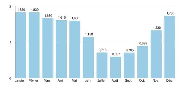 Aux étiages, le VCN3 peut chuter jusque 0,078 m3/s (78 litres), en cas de période quinquennale sèche[2], ce qui est loin d'être sévère pour un cours d'eau au bassin aussi exigu.