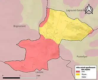 Le retrait-gonflement des sols argileux est susceptible d'engendrer des dommages importants aux bâtiments en cas d’alternance de périodes de sécheresse et de pluie. La totalité de la commune est en aléa moyen ou fort (88,8 % au niveau départemental et 48,5 % au niveau national). Sur les 180 bâtiments dénombrés sur la commune en 2019, 180 sont en aléa moyen ou fort, soit 100 %, à comparer aux 98 % au niveau départemental et 54 % au niveau national. Une cartographie de l'exposition du territoire national au retrait gonflement des sols argileux est disponible sur le site du BRGM[24],[Carte 1].