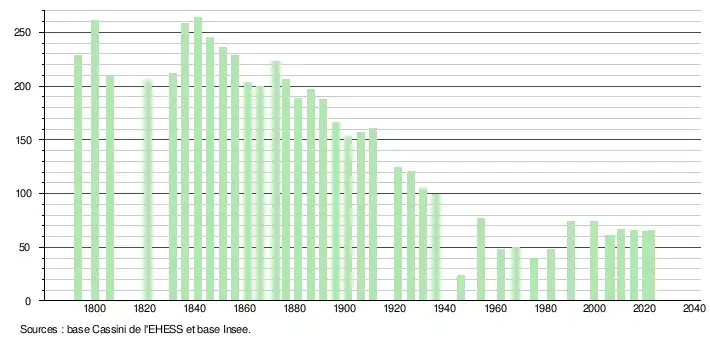 L'évolution du nombre d'habitants est connue à travers les recensements de la population effectués dans la commune depuis 1793. Pour les communes de moins de 10 000 habitants, une enquête de recensement portant sur toute la population est réalisée tous les cinq ans, les populations de référence des années intermédiaires étant quant à elles estimées par interpolation ou extrapolation[14]. Pour la commune, le premier recensement exhaustif entrant dans le cadre du nouveau dispositif a été réalisé en 2005[15].