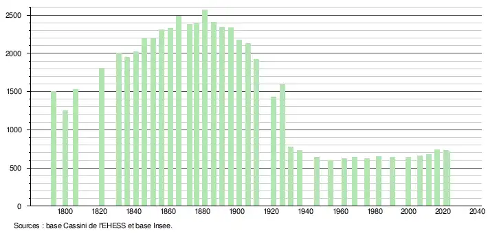 L'évolution du nombre d'habitants est connue à travers les recensements de la population effectués dans la commune depuis 1793. Pour les communes de moins de 10 000 habitants, une enquête de recensement portant sur toute la population est réalisée tous les cinq ans, les populations de référence des années intermédiaires étant quant à elles estimées par interpolation ou extrapolation[30]. Pour la commune, le premier recensement exhaustif entrant dans le cadre du nouveau dispositif a été réalisé en 2006[31].