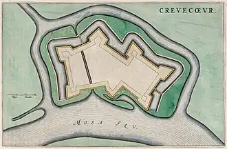 Le fort Crèvecœur (en bas à gauche) sur la rive de la Meuse carte de Kerkdriel tirée de Gemeente Atlas van Nederland (Atlas des communes des Pays-Bas), J. Kuyper 1865-1870.- Le fort Crèvecœur d'après Gualdo Priorato (1606-1678).