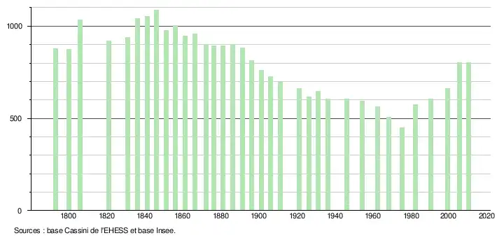 - ↑ Dans le tableau des recensements et le graphique, par convention dans Wikipédia, le principe a été retenu, pour les populations légales postérieures à 1999 de n’afficher dans le tableau des recensements et le graphique que les populations correspondant à l'année 2006, première population légale publiée calculée conformément aux concepts définis dans le décret no 2003-485 du 5 juin 2003, et les années correspondant à une enquête exhaustive de recensement pour les communes de moins de 10 000 habitants, ainsi que la dernière population légale publiée par l’Insee.