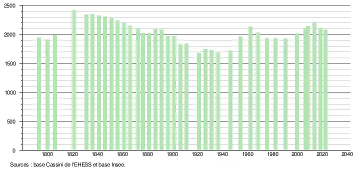 L'évolution du nombre d'habitants est connue à travers les recensements de la population effectués dans la commune depuis 1793. Pour les communes de moins de 10 000 habitants, une enquête de recensement portant sur toute la population est réalisée tous les cinq ans, les populations de référence des années intermédiaires étant quant à elles estimées par interpolation ou extrapolation[51]. Pour la commune, le premier recensement exhaustif entrant dans le cadre du nouveau dispositif a été réalisé en 2008[52].