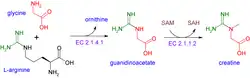 Dans les muscles, une fraction de la créatine totale se lie au phosphate. La réaction est catalysée par la créatine kinase, et résulte en phosphocréatine (PCr). La phosphocréatine se lie à l’ADP pour le reconvertir en ATP, une importante source d’énergie cellulaire.