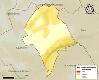 Le retrait-gonflement des sols argileux est susceptible d'engendrer des dommages importants aux bâtiments en cas d’alternance de périodes de sécheresse et de pluie. 55,9 % de la superficie communale est en aléa moyen ou fort (52,8 % au niveau départemental et 48,5 % au niveau national). Sur les 142 bâtiments dénombrés sur la commune en 2019, 114 sont en aléa moyen ou fort, soit 80 %, à comparer aux 70 % au niveau départemental et 54 % au niveau national. Une cartographie de l'exposition du territoire national au retrait gonflement des sols argileux est disponible sur le site du BRGM[18],[Carte 2].